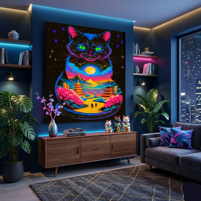 Leuchtende Farben gegen Dunkelheit: Der tiefschwarze Hintergrund mit weißen und blauen Sternen schafft den perfekten Kontrast zu den leuchtenden Farben der Katze und der inneren Landschaft. Blau, Pink, Gelb, Orange – jede Farbe strahlt mit voller Intensität. Das ist visuelle Magie in ihrer reinsten Form.