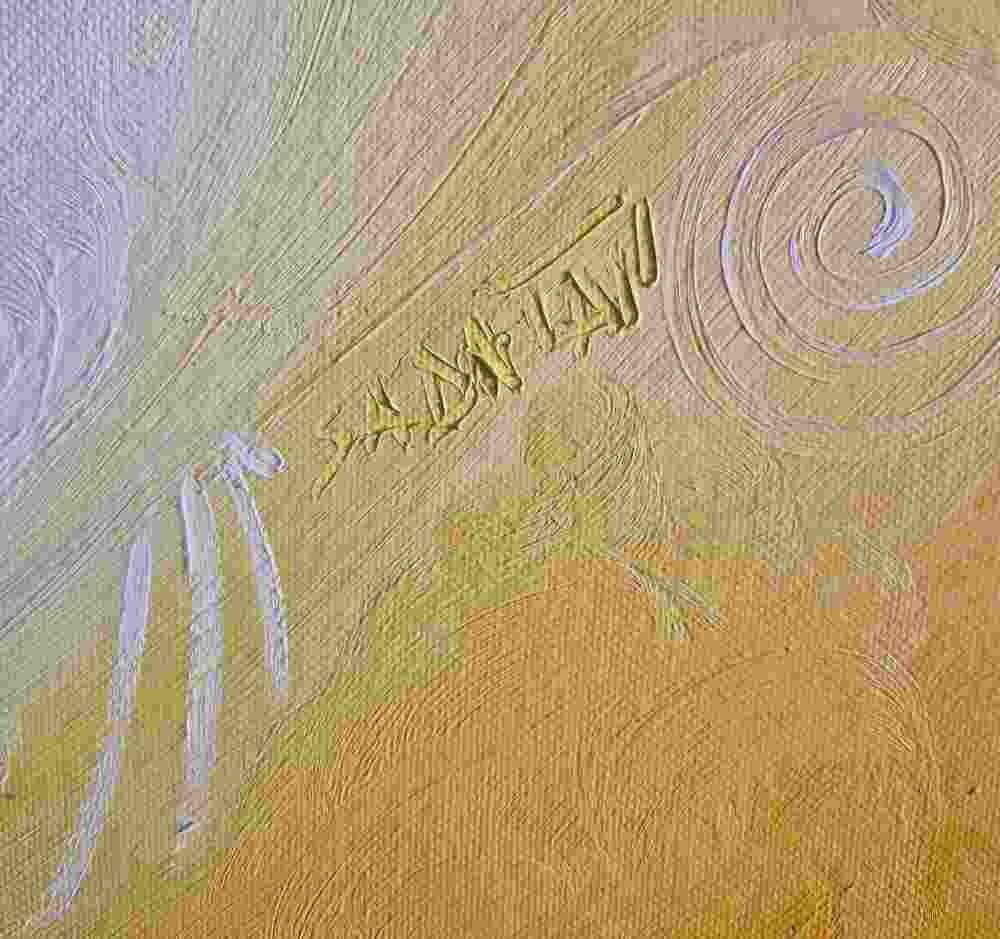 Ausdrucksstarkes Ölgemälde in warmen Gelb- und Goldtönen. Die ovale Komposition mit plastischen Strukturen verbindet auf poetische Weise die Sehnsucht nach senegalesischem Sonnenlicht mit der Realität des norddeutschen Himmels.