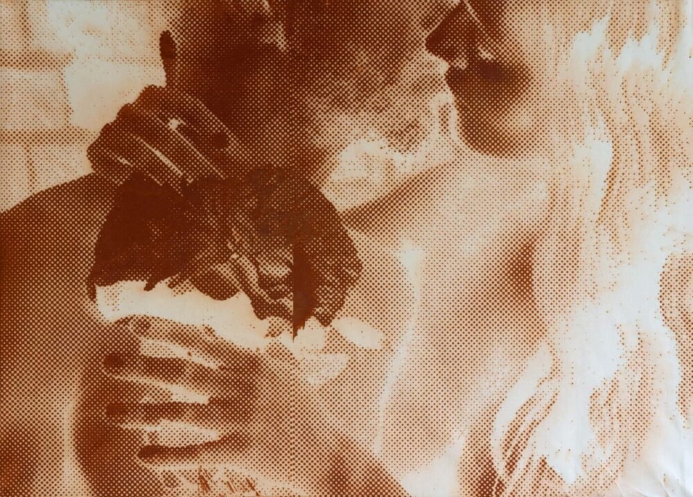 Als Grundlage dient eine Stahlplatte, die zunächst mit einer Schicht Lack überzogen wird. Das Druckmotiv wird manuell in den Lack eingearbeitet, indem man kratzt, schleift und bestimmte Bereiche abdeckt. Für den Druckprozess wird feuchtes Papier über einen längeren Zeitraum auf die Platte gepresst. Die Feuchtigkeit löst eine Rostbildung aus, die auf dem Papier eine Spur hinterlässt. Ohne zusätzliche Druckfarbe wird das Bild so direkt auf Papier oder Leinwand übertragen.